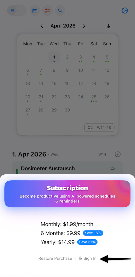 Recherchez l'option de connexion dans le dialogue d'abonnement lors de la première ouverture de l'app, ou allez dans Paramètres et trouvez la section compte/abonnement pour vous connecter avec votre compte web.